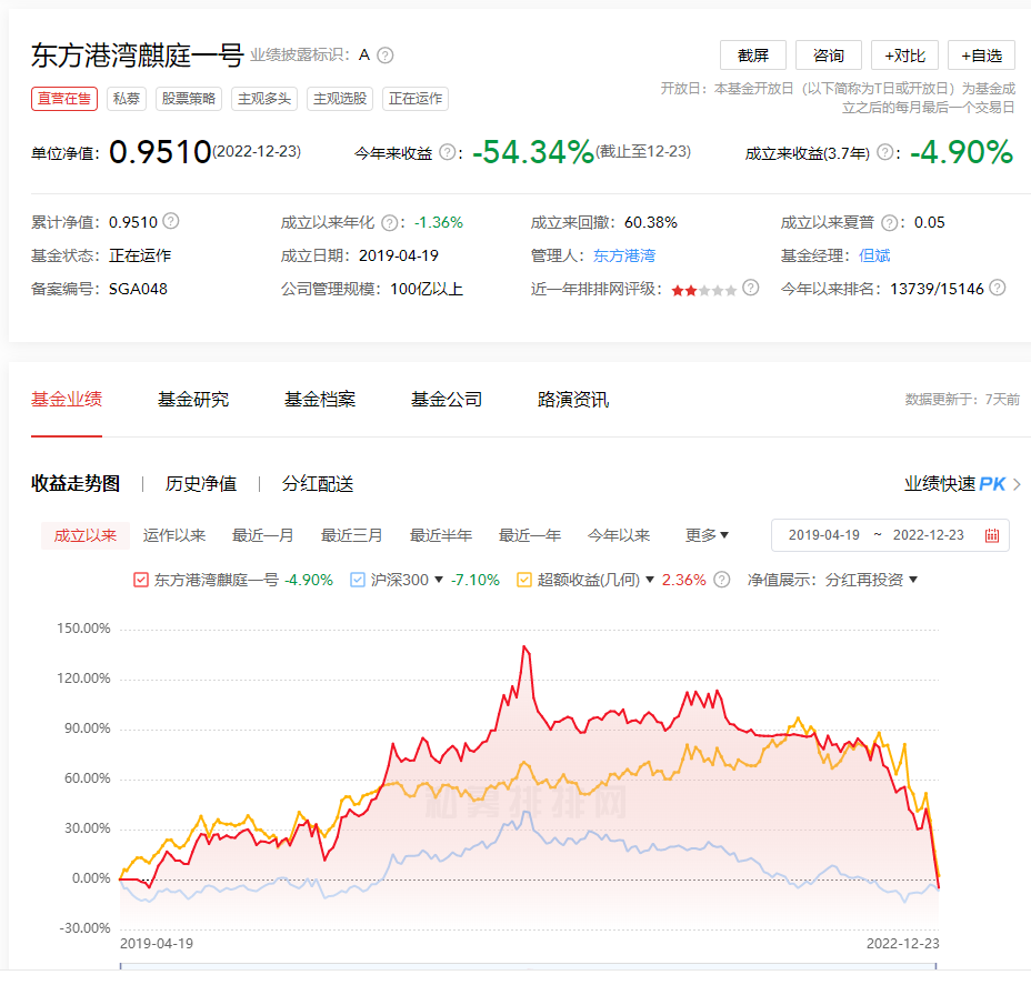 私募排排网的数据显示,但斌亲自管理“东方港湾麒庭一号”截至2022年12月23日的最新单位净值为0.9510元,年内收益亏损54.34%。从该产品的净值曲线来看,该产品近期出现断崖式下跌,呈现“直线俯冲向下”的走势。其中,按月份来看,该产品和目前A股市场表现格格不入。比如在今年11月,沪深300指数上涨了9.31%的情况下,该产品净值却下跌了8.48%。在12月份,截至12月23日,沪深300指数下跌1.1%,而该产品净值却暴跌了33.22%。