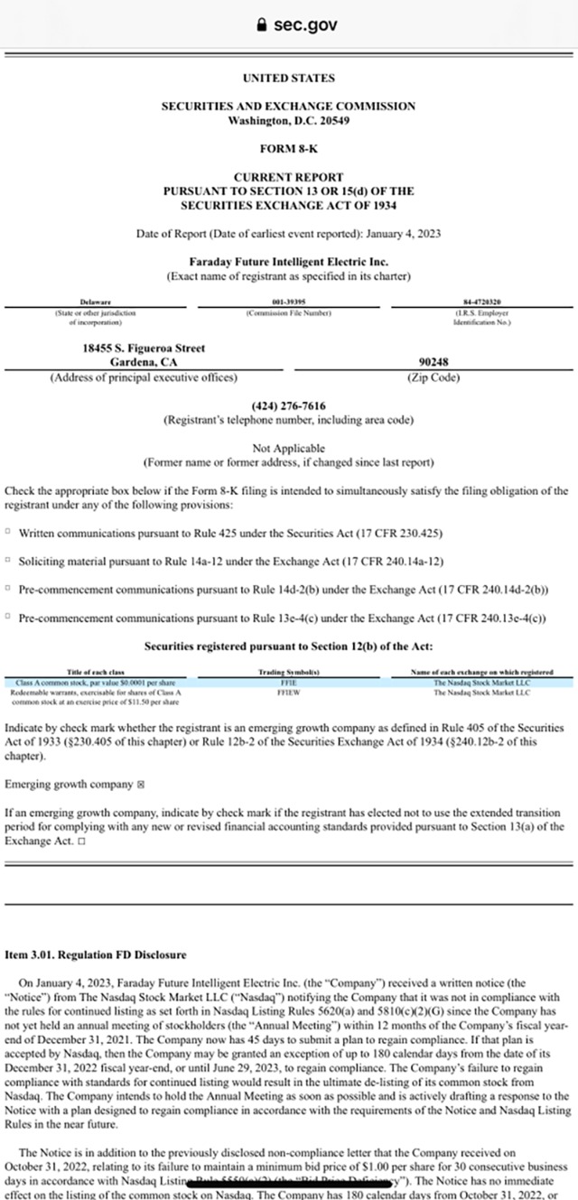 1月10日,法拉第未来公告称,公司于1月4日收到纳斯达克的书面通知。通知指出,因公司未及时举行年度股东大会,法拉第未来不符合纳斯达克的继续上市规则。