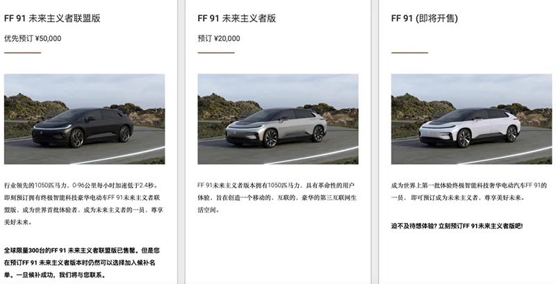 目前,法拉第未来官网显示,FF 91 处于即将开售状态;FF 91 未来主义者版可预订,预订价为2万元人民币;FF 91 未来主义者联盟版已经售罄,优先预订价为5万元人民币。需要说明的是,预订金随时全额可退。