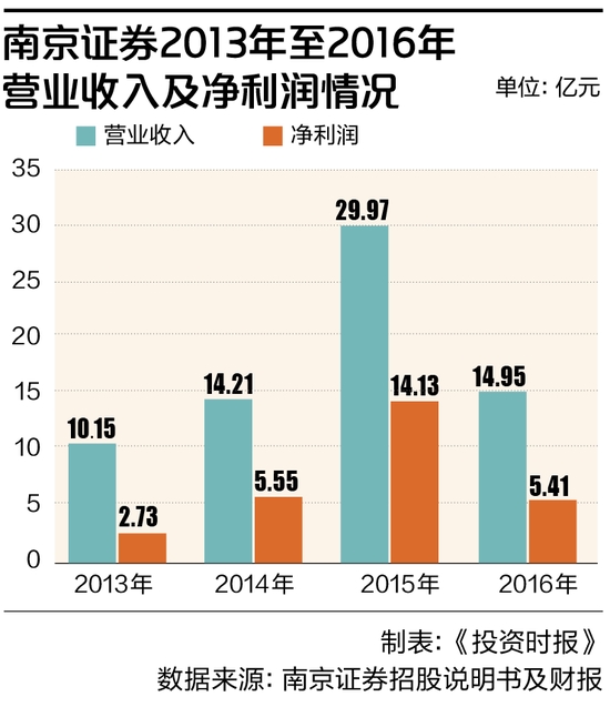 此前几年,南京证券业绩持续增长。招股书显示,其2013年至2015年实现营业收入10.15亿元、14.21亿元和29.97亿元,净利润分别为2.73亿元、5.55亿元和14.13亿元。