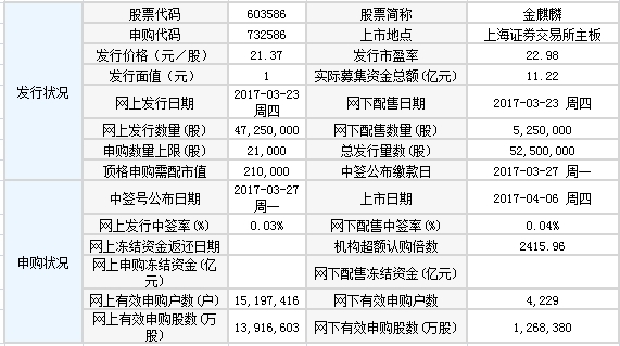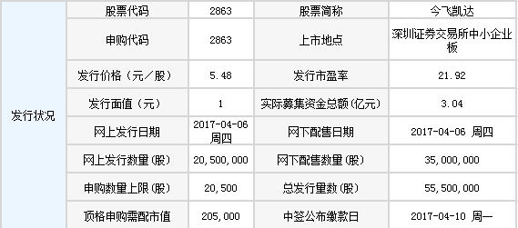 根据交易所公告,浙江今飞凯达轮毂股份有限公司于2017年4月6日进行网上和网下申购。本次公开发行股票总数量为5,550万股,全部为新股。回拨机制启动前,网下初始发行数量为3,500万股,占本次发行总股数的63.06%;网上初始发行数量为2,050万股,占本次发行总股数的36.94%。