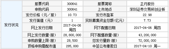 根据交易所公告,江苏正丹化学工业股份有限公司于2017年4月6日进行网上和网下申购。本次拟公开发行股票7,200万股,全部为公开发行新股,不设老股转让,本次发行后公司总股本不超过28,800万股。网下初始发行数量为4,320万股,占本次发行总量的60.00%;网上初始发行数量为2,880万股,占本次发行总量的40.00%。