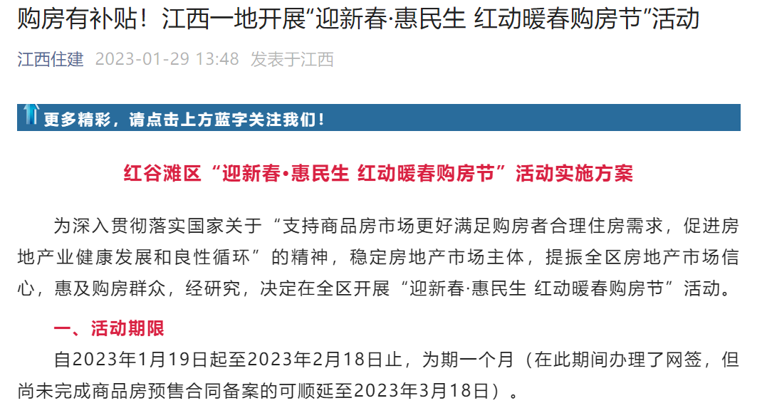 同日,“江西住建”微信公众号发文称,江西一地开展“迎新春·惠民生红动暖春购房节”活动,优惠政策包括购房补贴、促销奖励等。