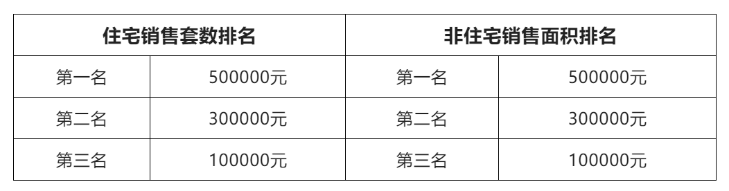 (二)促销奖励。在让利惠民的原则下,房地产企业制定实施新春优惠促销方案(不低于政府政策补贴),并在销售中心公示,区政府对活动期间住宅销售套数超过20套以上及非住宅销售面积超过2000平方米以上的房地产开发企业,根据网签备案数据进行评定排名,并按排名情况给予以下奖励: