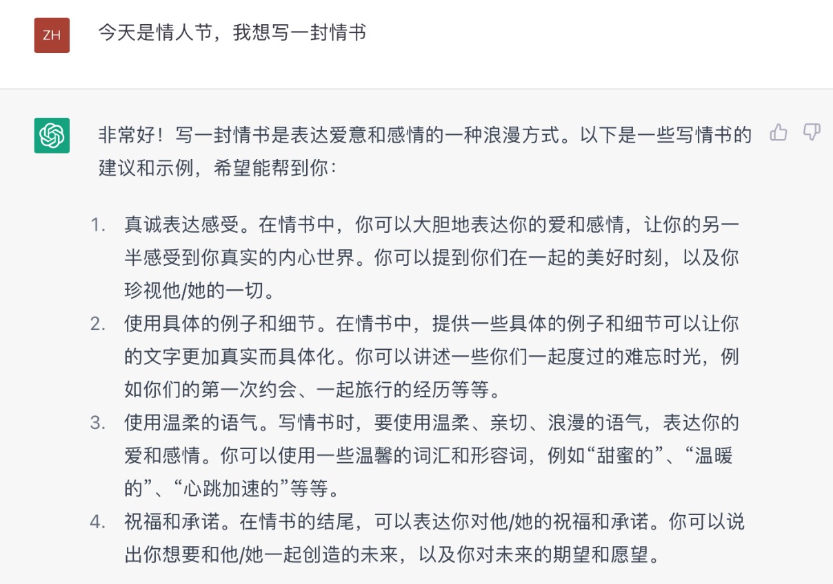 情人节当天,澎湃科技打开ChatGPT,要求其帮忙写一封情书。很快,它给出了详细的答案,先是提出写情书的建议:
