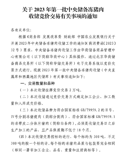 根据华储网发布收储通知,2月24日下午13:00,收储交易将正式开市,收储品种为符合国家标准GB/T9959.2的II号、IV号分割冻猪瘦肉(简称分制肉),符合国家标准GB/T9959.1的冻带皮二分体片猪肉(简称白条肉)。符合条件的生猪定点屠宰加工企业可参加交易,每个企业成交数量不超过20个标的,即不超过6000吨。