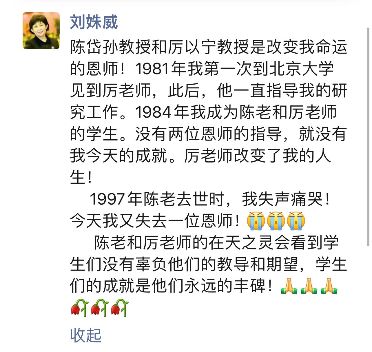 中央财经大学中国企业研究中心研究员刘姝威在微信朋友圈发文悼念厉以宁教授。