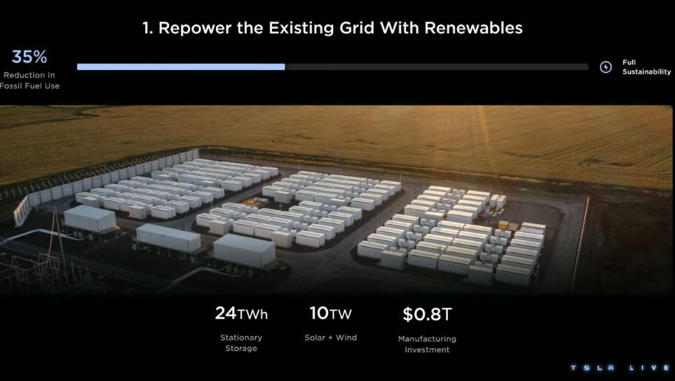 05:40【马斯克“宏图计划”:储能240 TWH、可再生电力30 TWH 制造投资10万亿美元】马斯克介绍“宏图计划”:储能240 TWH,可再生电力30 TWH,制造投资10万亿美元,能源要求不到燃料经济的一半。