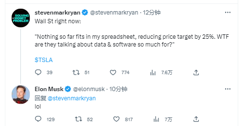 06:40 特斯拉股价盘后下跌约2.5%。有用户在推特上调侃华尔街称:“华尔街现在:‘到目前为止他们没有提到我表格上所预期的,将目标价下调25%。他们讨论这么多数据和软件干嘛?’特斯拉CEO马斯克回复:”哈哈。