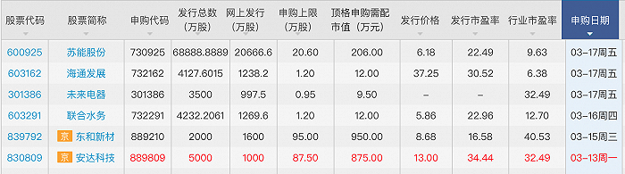 3月17日有3家申购,分别是未来电器(301386.SZ)、海通发展(603162.SH),以及苏能股份(600925.SH),三者的申购上限分别为0.95万股、1.2万股、20.6万股。