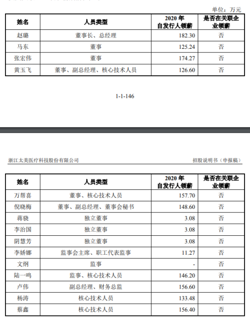 太美科技长期亏损也引起监管层注意,在问询中,上交所要求太美科技说明达到盈亏平衡的基础条件和经营环境,说明营业收入的快速增长是否具有可持续性。太美医疗表示根据测算,假设公司收入规模增长至 15 亿收入以上的水平,且毛利率维持在 40%以上,期间费用率下降至 40%以下,若以上假设条件均可达成,将实现扭亏为盈。尽管持续亏损,与公司持续亏损形成反差的是,太美医疗高管薪酬逆势大幅上涨。招股书信息显示,2020年,太美医疗董事长赵璐2020年年薪182.3万元,2021年上涨至349.26万元,涨幅92%,公司其他高管薪酬也出现不同幅度的上涨。2020年,公司14位董事、监事、高级管理人员及核心技术人员薪酬1524.8万元,平均年薪超过108.9万元,2021年,上述14位董事、监事、高级管理人员及核心技术人员薪酬涨至2120.99万元,平均年薪超151万元。