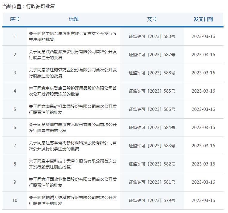 3月16日,根据证监会网站消息,中信金属、江盐股份、常青科技、中重科技、柏诚股份、中电港、陕能股份、海森药业、登康口腔、南矿集团等10家主板IPO获得证监会批复,证监会同意上述企业首次公开发行股票的注册申请。