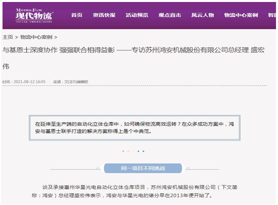 另据此前有媒体报道报道第一段就提出:苏州鸿安机械股份有限公司(下文简称:鸿安)总经理盛宏伟表示,鸿安与华星光电的缘分早在2013年便开始了。还具体报道:“到了2018年,鸿安又积极参与了惠州华星光电M7自动化立体仓库项目的规划、设计及建设工作,在保证系统技术指标和运行稳定性达标的前提下,按时交付项目,获得了华星光电的充分肯定。”