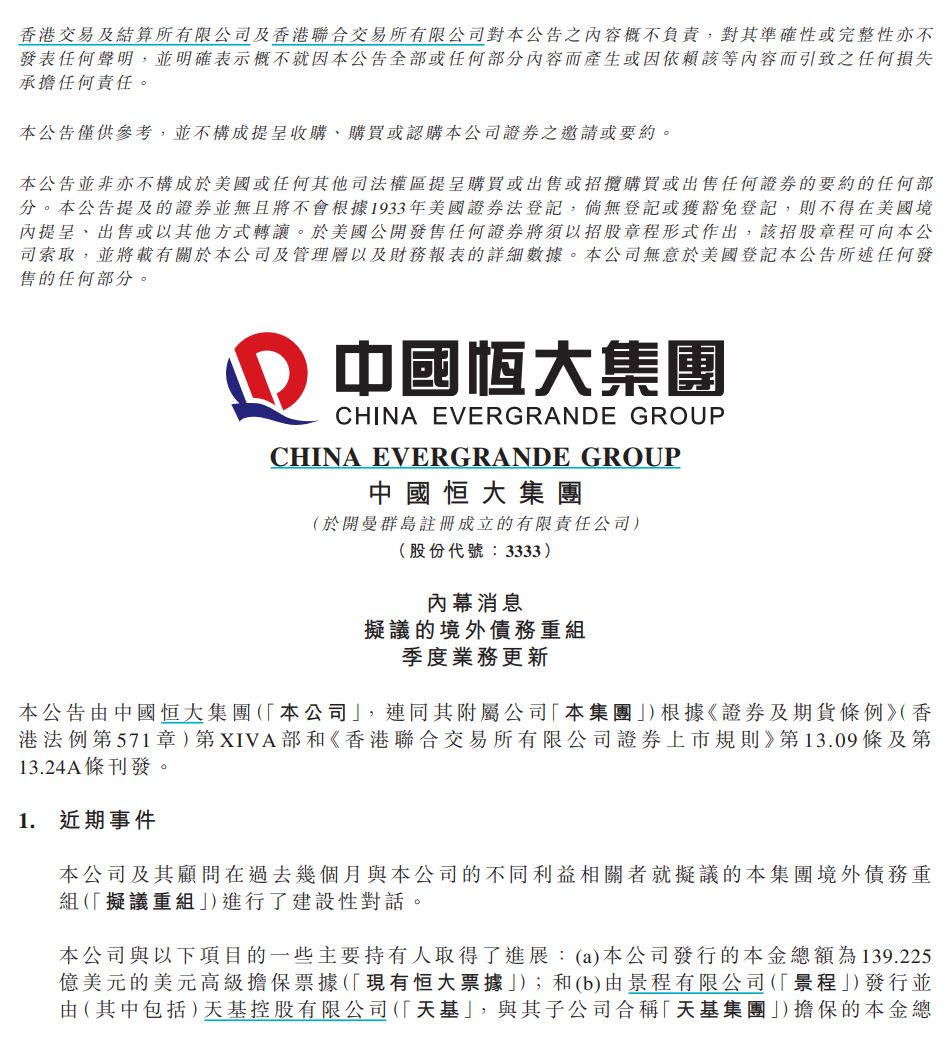另外,恒大称,公司与以下项目的一些主要持有人取得了进展:公司发行的本金总额为139.225亿美元的美元高级担保票据;和由景程有限公司发行并由天基控股有限公司担保的本金总为52.26亿美元的美元优先票据。公司欣然宣布,这些讨论最终与现有票据持有人特别小组成员就拟议重组的核心条款达成具有约束力的协议。中国恒大预计重组协议将于10月1日起生效,对境外无担保债权人的预估回收料约97.3亿元人民币。