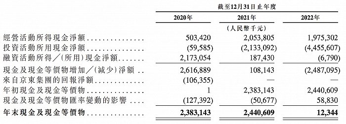 受上述收入项的影响,2020至2022年三年间京东产发的年度盈利分别为28.13亿元、14.94亿元、22.2亿元。三年间京东产发也录得正向经营活动现金流,经营活动所得现金净额分别为5.79亿元、7.13亿元、17.31亿元。