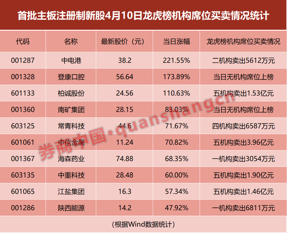 摘要:  新股的疯狂,“底气”来自何方?  4月10日盘后,龙虎榜出炉,首批10只主板注册制新股上市首日全线大涨背后的资金也浮出水面。具体来看,机构资金清一色地“卖出”,8只新股被机构席位卖出,而在买入的席...