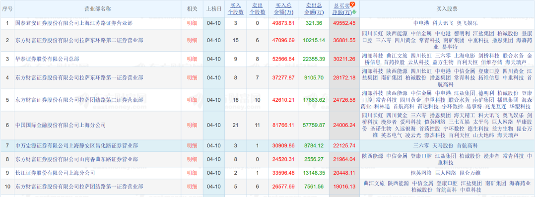 从活跃营业部来看,4月10日当天总买卖净额最大的是国泰君安上海江苏路营业部,总买卖净额达到4.96亿元,主要买入的标的有刚上市的中电港,以及TMT板块的热门股科大讯飞奥飞娱乐