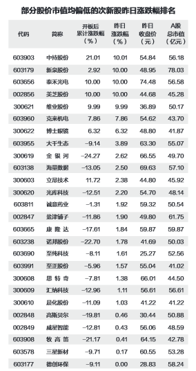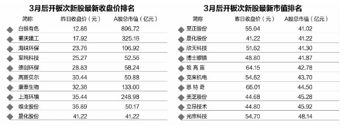 数据宝统计显示,3月打开“一”字板的次新股中,白银有色最新价最低,仅为12.86元;重庆建工次之,仅为17.92元;此外,海峡环保、至纯科技、德创环保等个股最新价不足30元。市值方面,至正股份、晨化股份、欣天科技、博士眼镜等个股市值不足42亿元;牧高笛、克来机电、思特奇等个股市值不足45亿元。