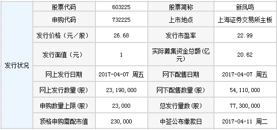 根据交易所公告,新凤鸣集团股份有限公司于2017年4月7日进行网上和网下申购。本次发行股份数量为7,730万股。回拨机制启动前,网下初始发行数量为5,411万股,为本次发行数量的70%;网上初始发行数量为2,319万股,为本次发行数量的30%。最终网下、网上发行数量将根据网上网下回拨情况确定。本次发行不进行老股转让。