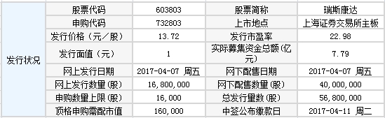 根据交易所公告,瑞斯康达科技发展股份有限公司于2017年4月7日进行网上和网下申购。本次公开发行总量为5,680万股,全部为新股发行,无老股转让。回拨机制启动前,本次网下初始发行数量为4,000万股,为本次发行数量的70.42%;网上初始发行数量为1,680万股,为本次发行数量的29.58%。