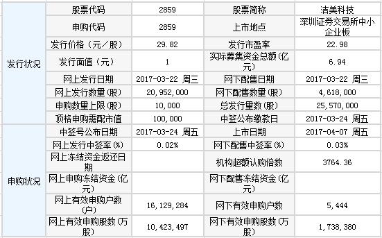 回拨后,网下最终发行数量为555万股,占本次发行总量的10%;网上最终发行数量为 4995万股,占本次发行总量90%。回拨后本次网上发行最终中签率为0.0309202497%,有效申购倍数为3,234.12654倍。