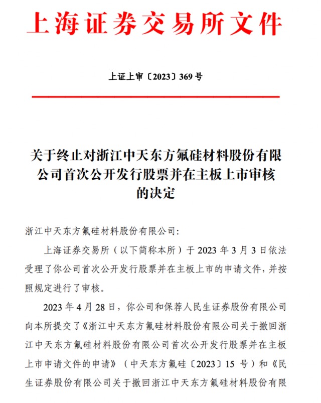 5月15日晚间,上交所官网显示,浙江中天东方氟硅材料股份有限公司(以下简称“中天氟硅”)沪市主板IPO处于终止状态,这也是全面注册制以来首家主板IPO撤单企业。