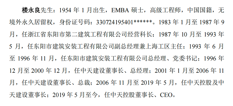 从履历来看,楼永良生于1954年1月,曾有过一段相当长的在东阳市建筑安装工程有限公司任职的经历。