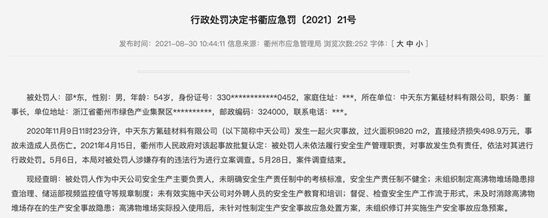 2021年8月30日,衢州市应急管理局于对中天氟硅出具了《行政处罚决定书》,公司被罚款50万元,彼时中天氟硅的董事长邵向东被罚款19.56万元。