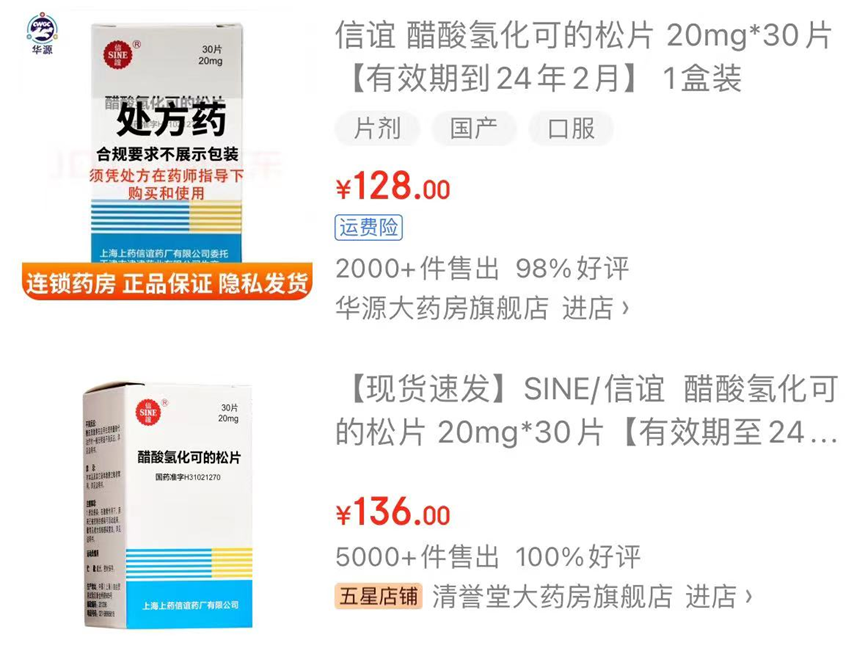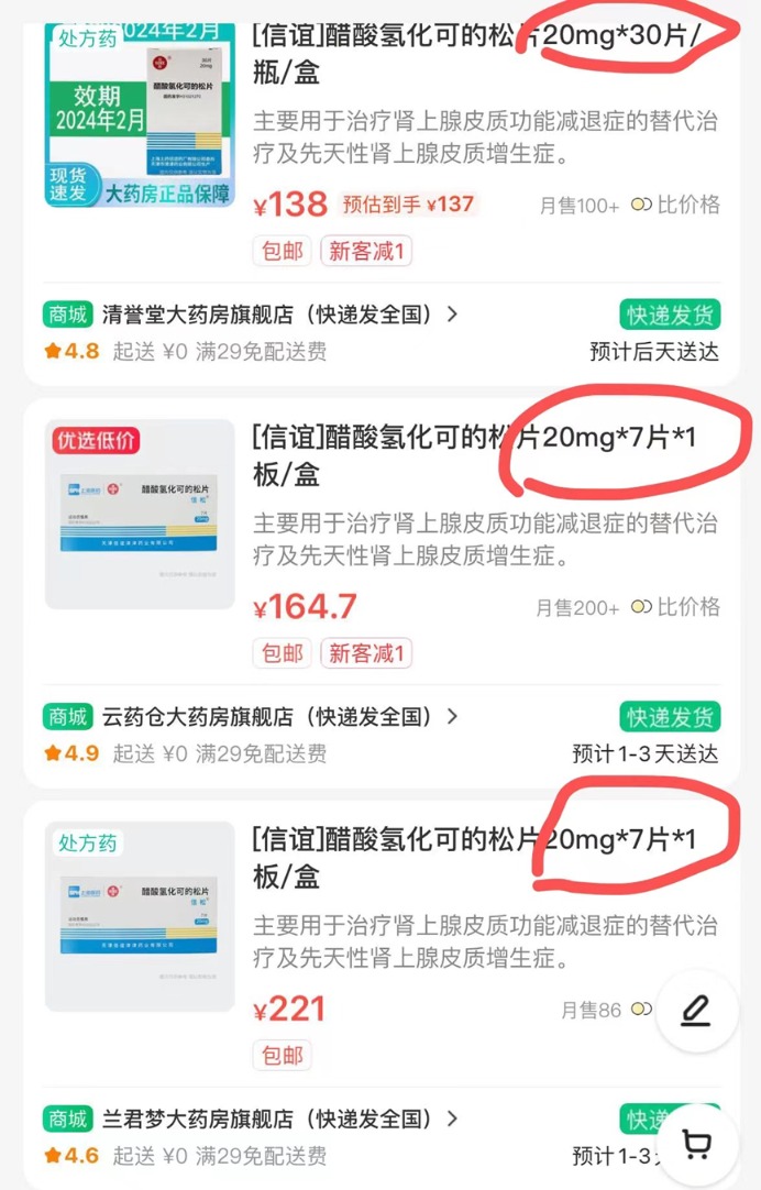 例如,清誉堂大药房旗舰店显示,30片瓶装的醋酸氢化可的松片价格为138元/瓶。而云药仓大药房旗舰店的7片盒装价格为164.7元/盒,兰君梦大药房旗舰店的报价更是高达221元/盒。