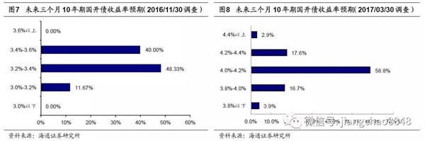 资金面预期仍偏紧。17年一季度货币政策持续偏紧,货币市场利率中枢明显上行。调查结果显示,投资者预期资金利率仍将在高位:约42%的受访者认为未来三个月R001中枢将在2.4%-2.6%;接近31%的受访者认为其会进一步抬升至2.6%-2.8%。42%的受访者认为R007将在3.0%-3.2%之间波动;28%的受访者认为R007会进一步抬升至3.2%-3.4%。