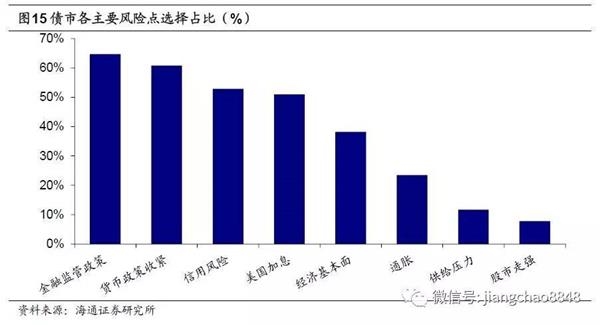 债市仍最担心政策风险。对于债市最担心的风险点,受访者最担心的是金融监管政策,目前虽然MPA考核暂告一段落,但同业存单量价仍高,监管出手概率较高,此外,大资管新规和理财新规仍未落地,监管政策仍是决定债市走势的主要变量。此外金融去杠杆仍在推进,美国加息节奏加快,货币政策收紧成为投资者第二关心的风险点。随着近期民企信用事件报告,投资者对信用风险也较担心。