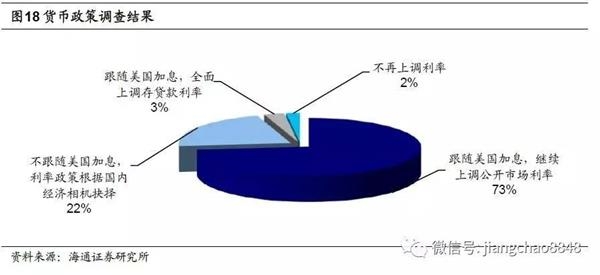 对于是否继续上调公开市场操作利率或上调存贷款利率,绝大多数投资者认为央行将“跟随美国加息,继续上调公开市场利率”,但认为会上调存贷款利率的仅占3%,有接近1/4的受访者认为不会跟随美国加息,国内货币政策主要看经济基本面。