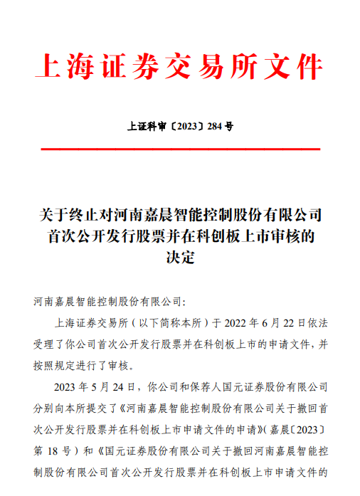 日前,河南嘉晨智能控制股份有限公司(以下简称嘉晨智能)撤回科创板发行上市申请。同时,上交所终止嘉晨智能发行上市审核。