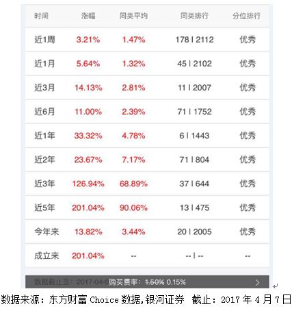 国泰成长优选混合成立于2012年3月份,成立以来收益率201.04%,年化收益高达47.39%,远超同类平均近35个百分点,长期、中期、短期业绩均稳居四分位优秀行列,近3年收益126.94%,近1年收益33.32%,在1443只同类基金中排名第6。