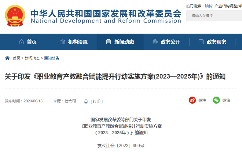 6月13日,国家发改委网站显示,近日,国家发改委、教育部等八部门联合印发《职业教育产教融合赋能提升行动实施方案(2023—2025年)》,提出5方面19条政策措施。同日,国家发改委召开专题新闻发布会介绍推进实施职业教育产教融合赋能提升行动有关情况。