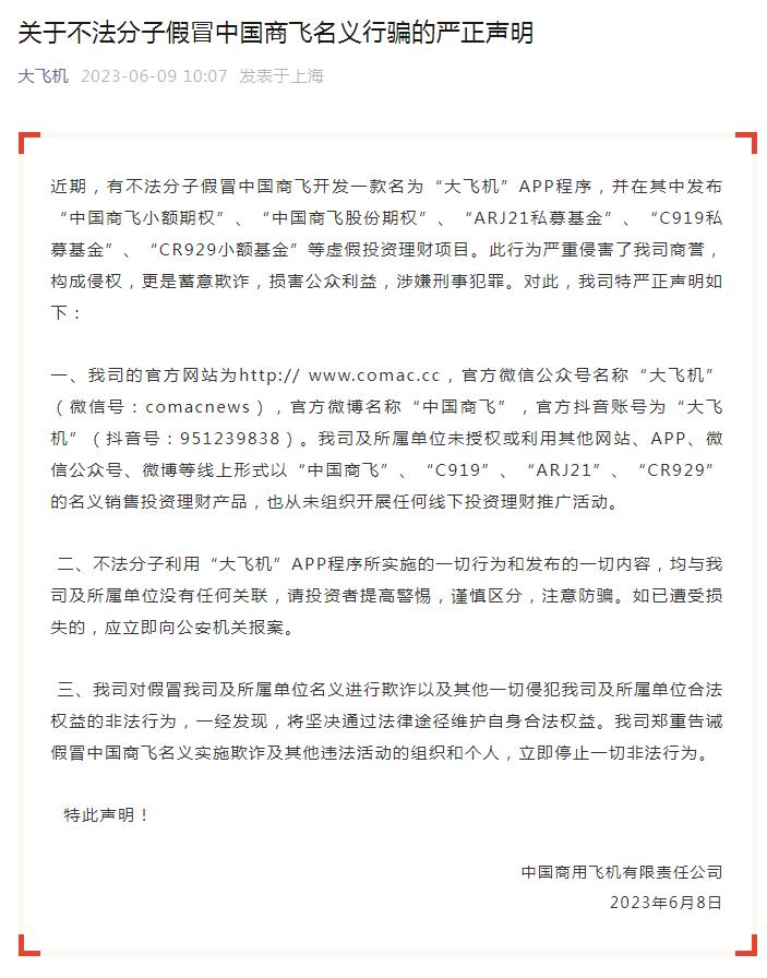 另据“大飞机”微信公众号6月9日发布的《关于不法分子假冒中国商飞名义行骗的严正声明》,有不法分子假冒中国商飞开发一款名为“大飞机”APP程序,并在其中发布“中国商飞小额期权”、“中国商飞股份期权”、“ARJ21私募基金”、“C919私募基金”、“CR929小额基金”等虚假投资理财项目。