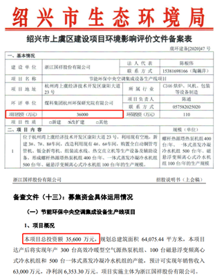 绍兴市生态环境局发布的项目环境影响评价文件备案表显示,该项目投资36000万元,与招股书并不一致。同样,备案表披露,项目实施投产后,将形成热泵机组400台/年,与招股书披露相差100台/年。同是公开文件,募投项目投资额和产能数据却是两个版本,国祥股份信息披露准确性存在疑问。