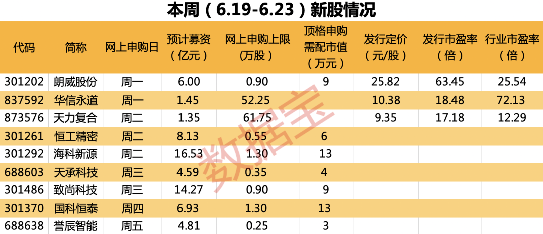本周9只新股中,科创板新股为天承科技、誉辰智能,创业板新股有朗威股份、恒工精密、海科新源、致尚科技、国科恒泰,北交所有华信永道、天力复合。