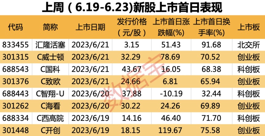 上周(6月19日到6月23日),一共有8只新股上市发行。从上市表现来看,背靠千亿疫苗巨头智飞生物的C智翔-U发行价为3.88元/股,在科创板上市首日以-10.19%的收盘价破发。另外,该股遭网上投资者弃购414.15万股,弃购金额达1.57亿元,弃购率19%创阶段新高。