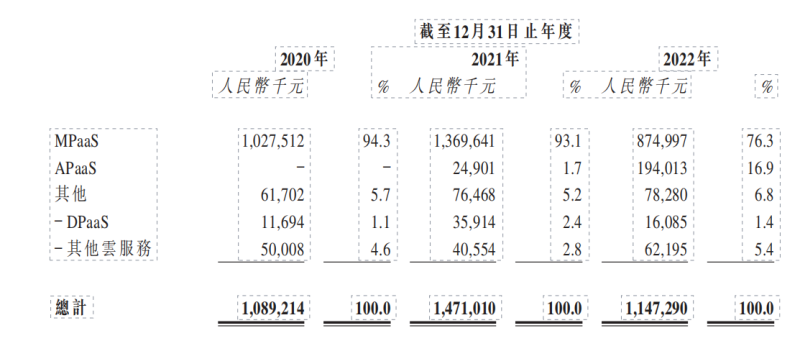 2020-2022年,七牛云来自MPaaS产品的收益占比不断下滑,金额分别为10.275亿元、13.696亿元及8.75亿元,相当于同期总收益约94.3%、93.1%及76.3%。来自APaaS解决方案的收益占比不断增加,金额分别为0、2490万元及1.94亿元,相当于相同期间总收益的0、1.7%及16.9%。
