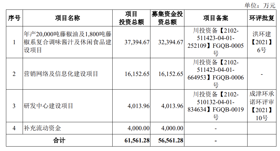 本次上市,幺麻子计划募集资金约5.66亿元,扣除发行费用后将用于年产20000吨藤椒油及1800吨藤椒系复合调味酱汁及休闲食品建设项目、营销网络及信息化建设项目、研发中心建设项目和补充流动资金。