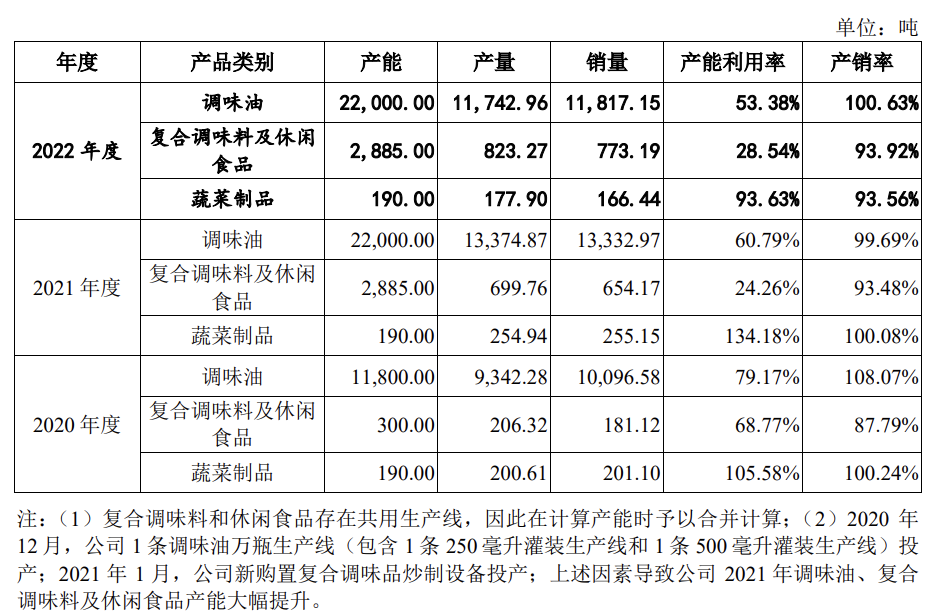 幺麻子表示:“公司的调味油产能利用率在2021年下降,主要原因为2020年底新的调味油包装生产线投产导致成品灌装能力大幅提升;调味油产能利用率在2022年同比有所下滑,主要原因为国内受外部环境影响,导致餐饮市场需求疲弱。”