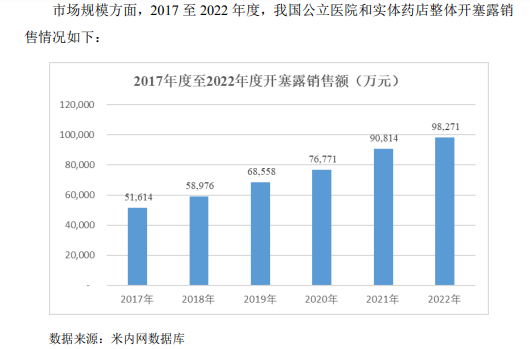 此外,小方制药招股书披露还存在自相矛盾之外。公司引用米内网数据显示,2020年至2022年,国内开塞露市场规模约7.677亿元、9.08亿元和9.83亿元。小方制药市场份额分别为17.57%、16.06%和 16.42%。由此推算,2020年至2022年,小方制药开塞露销售额约为1.348亿元、1.458亿元和1.614亿元。但招股书又披露,上述年度,小方制药开塞露销售额1.97亿元、2.04亿元和2.31亿元,这与对应的市场份额并不一致,小方制药并未解释上述差异的原因。