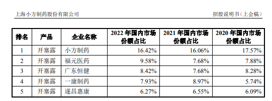 而对比此前的公告发现,近年来,小方制药主要产品“信龙”牌开塞露市场占有率已经大幅下降。公司此次发布的招股说明书显示,2020年小方制药开塞露国内市场占有率17.57%、2022年为16.42%。对此小方制药招股书称,公司产品已具备较强的竞争力和较高的市场认可度,但开塞露市占率从2017年的48%下降到2022年的16.42%,与前述远大医药公告披露并不相符。