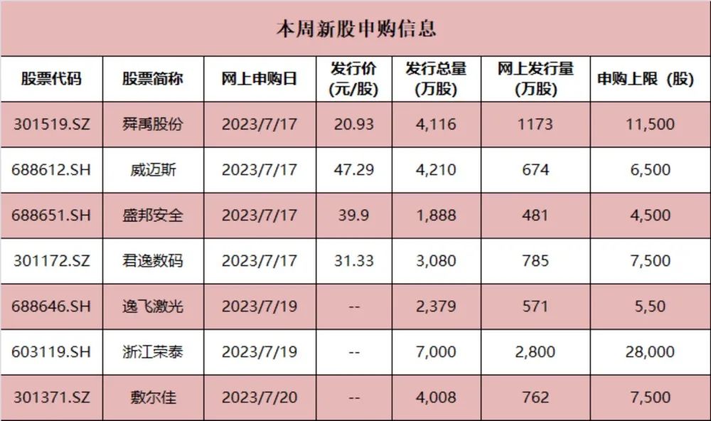 本周(7月17日—7月21日),共有7只新股将进行申购,其中创业板3只(舜禹股份君逸数码敷尔佳),科创板3只(威迈斯盛邦安全逸飞激光),沪市主板1只(浙江荣泰)。