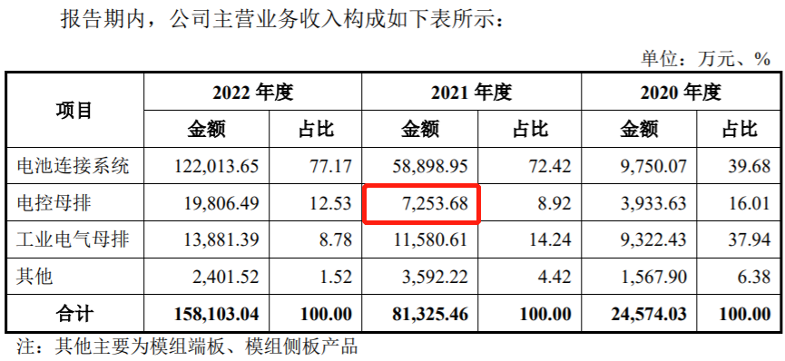 但与此同时招股书披露2021年销售电控母排总金额仅为7253.68万元,尚不及详细客户销售数据中,对比亚迪、法拉电子两家客户销售的电控母排金额高;更不用提在《审核问询函的回复》第4页披露,公司在2021年销售的电控母排总金额更是仅为6053.78万元,与招股书披露数据相差更大。