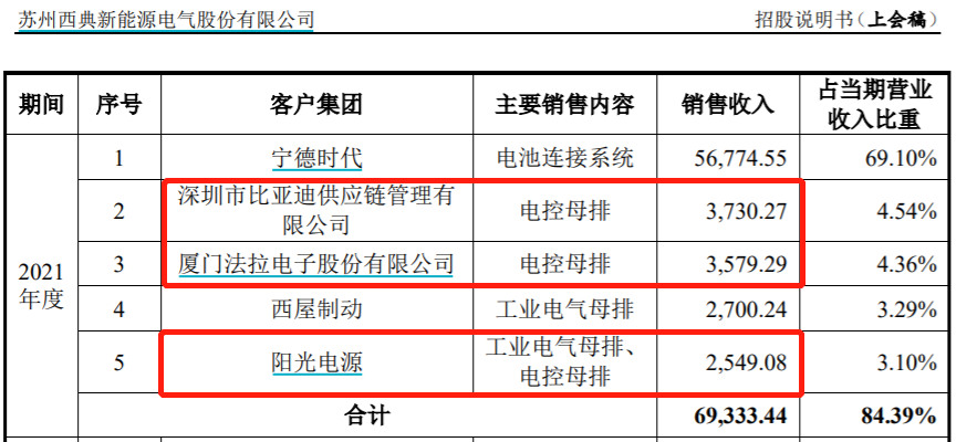 不仅如此,根据招股书披露,早在2014年公司在工业电气母排业务稳定发展的基础上,瞄准新能源汽车的发展机遇,正式推出用于新能源汽车领域的电控母排,并成为比亚迪、法拉电子的供应商。直到目前,比亚迪、法拉电子仍然是西典新能电控母排的主要客户,招股书披露2021年公司向比亚迪和法拉电子销售电控母排金额分别为3730.27万元和3579.29万元,合计为7309.56万元,这还没算上同年向客户阳光电源也销售了部分电控母排。