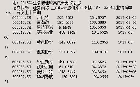 尽管新股业绩“变脸”备受市场诟病,但在今年上市且已公布2016年年报的次新股中,有逾八成的次新公司业绩报喜。业内人士分析,虽然近期次新股整体表现较为一般,但在业绩支撑和高转送刺激的带动下,部分估值相对较低的次新股仍值得投资者关注。