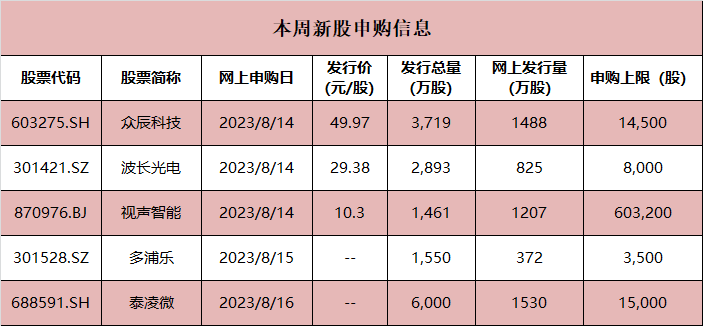本周(8月14日—8月18日),共有5只新股将进行申购,其中创业板2只(波长光电多浦乐),科创板1只(泰凌微),沪市主板1只(众辰科技),北交所1只(视声智能)。