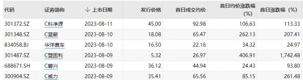 此外,8月10日登陆创业板的蓝箭电子(301348)首日上涨207.4%收报55.58元,盘中最高至84.24元,涨幅达365.9%。公司发行价为18.09元/股,以收盘价计算,该股单签盈利达1.87万元;以盘中最高价计算,单签盈利达3.3万元。